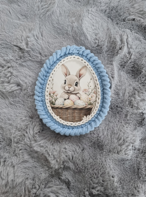 Urocza, ręcznie wykonana przywieszka wielkanocna, która wprowadzi do wnętrza ciepły, świąteczny klimat. Ozdoba przedstawia sympatycznego króliczka siedzącego w koszyczku z pisankami, otoczonego dekoracyjną ramką wykonaną ze sznurka. Całość utrzymana w delikatnej, pastelowej kolorystyce – idealnej na Wielkanoc.