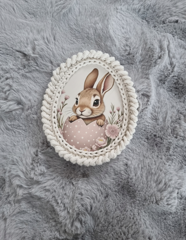 Urocza, ręcznie wykonana przywieszka wielkanocna, która wprowadzi do wnętrza ciepły, świąteczny klimat. Ozdoba przedstawia sympatycznego króliczka siedzącego w koszyczku z pisankami, otoczonego dekoracyjną ramką wykonaną ze sznurka. Całość utrzymana w delikatnej, pastelowej kolorystyce – idealnej na Wielkanoc.